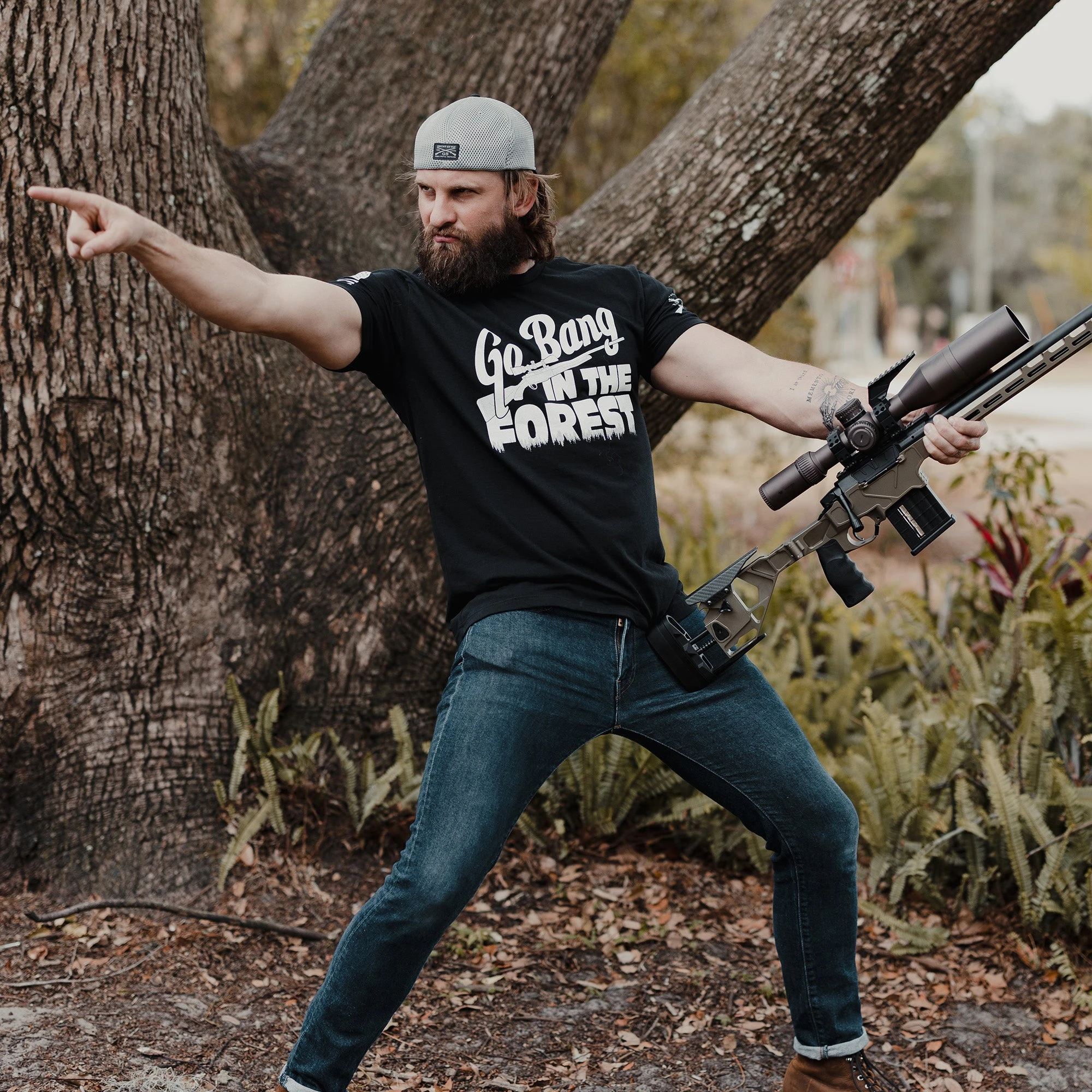 Now that’s enough to get any man excited. We’re talking about guns and firearms! What did you think we were talking about? Whatever your mind leads you to, order this “Go Bang in the Forest” graphic t-shirt now and continue banging in the forest, however you wish…you dirty devil.