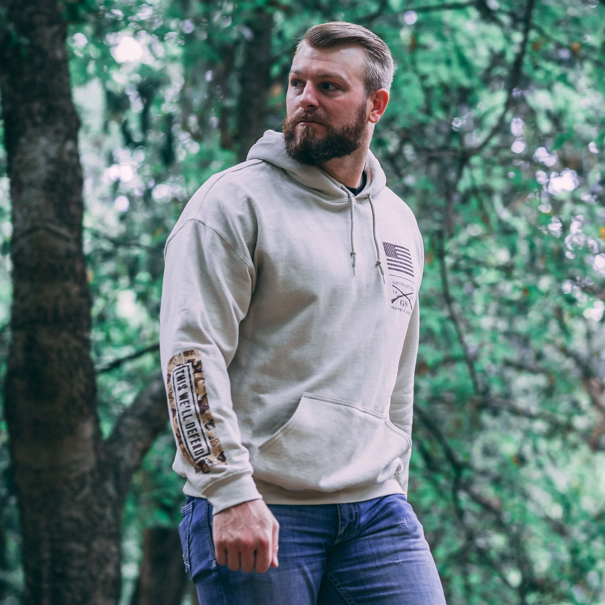 Our This We’ll Defend Sleeve Desert Camo Hoodies are crafted with the following details: